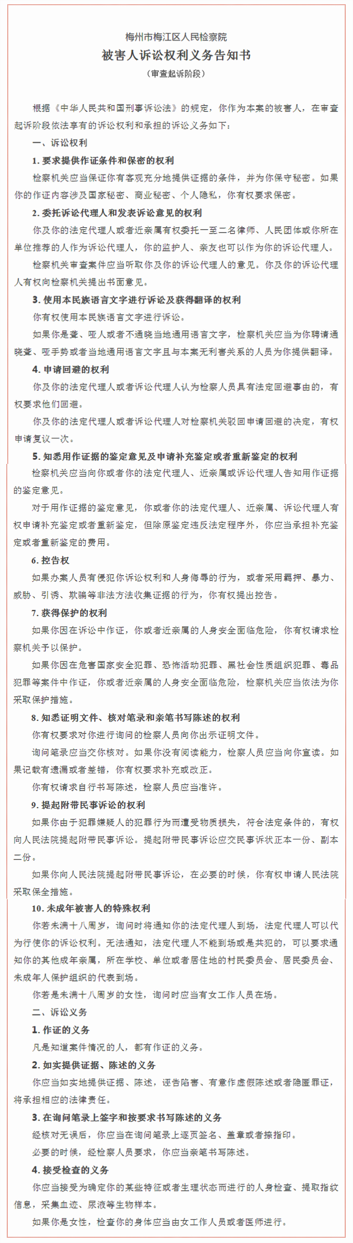 因本案被害人人数众多,且部分被害人因客观原因无法送达本法律文书,根据《中华人民共和国刑事诉讼法》相关规定,现告知被害人审查起诉阶段享有的诉讼权利义务,详见《梅州市梅江区人民检察院被害人诉讼权利义务告知书》。